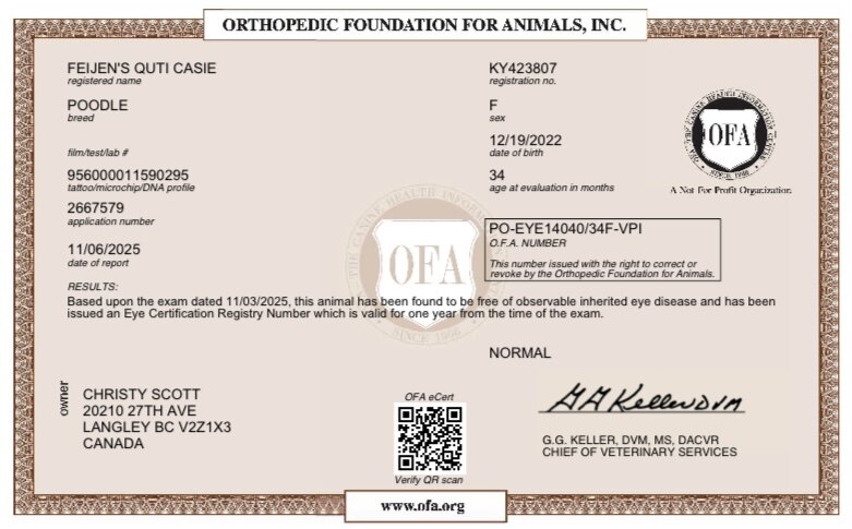 Casie is a 30 pound 19" moyen poodle. She is a funny, agile, cuddly girl. She has had one litter and is a natural mom. She currently lives with her guardian family on Vancouver island.